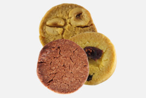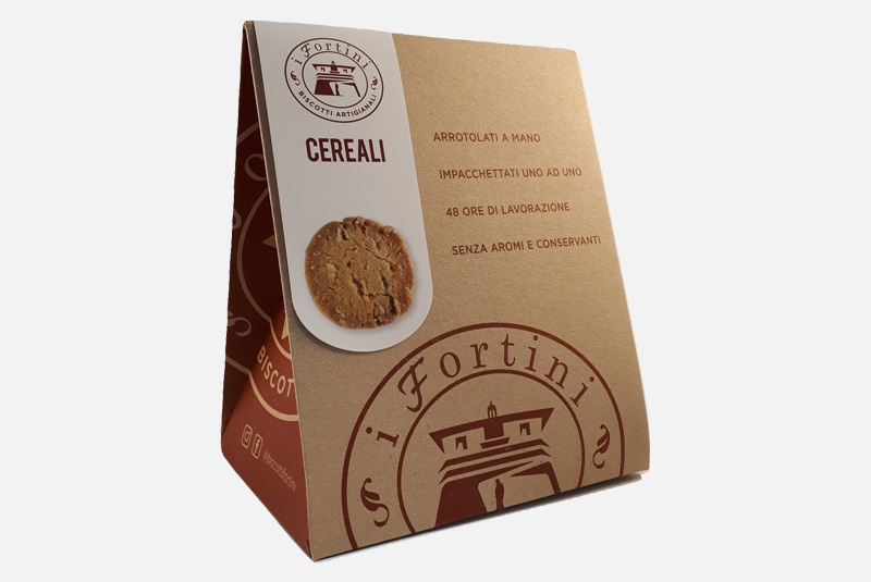 Biscotti di pasta frolla arrotolati a mano, con fiocchi ai cinque cereali cotti al vapore, rullati ed essiccati.